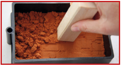 Tipp: Wenn der Sandformkasten auf ein kleines Brett gestellt wird, kann er einfacher umgedreht werden. Der zweite Sandformrahmen wird auch in drei Schichten mit Öl-Formsand befüllt. Also: Grundfläche zu einem Drittel mit Öl-Formsand befüllen, Formsand mit dem Stampfholz eindrücken, nächste Schicht Öl-Formsand auffüllen, feststampfen, nächste Schicht Öl-Formsand auffüllen.