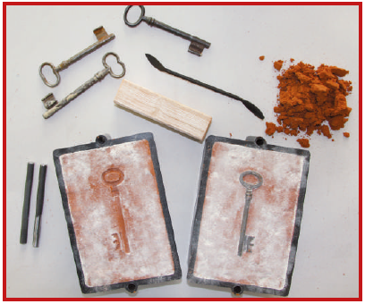 Herstellung einer Gussform für Teile mit ebener Rückseite, z.B. Plaketten, Türschilder, Medaillen, Beschläge etc.: Für die Abformtechnik in Verbindung mit Öl-Formsand Bestell.-Nr. 336354 benötigen Sie einen Sandformkasten Bestell.-Nr. 336255, der aus 2 Teilen (Ober- und Unterteil) besteht. Dabei wird in der Mitte, also zwischen den beiden Formrahmen, der Abformgegenstand eingebettet.