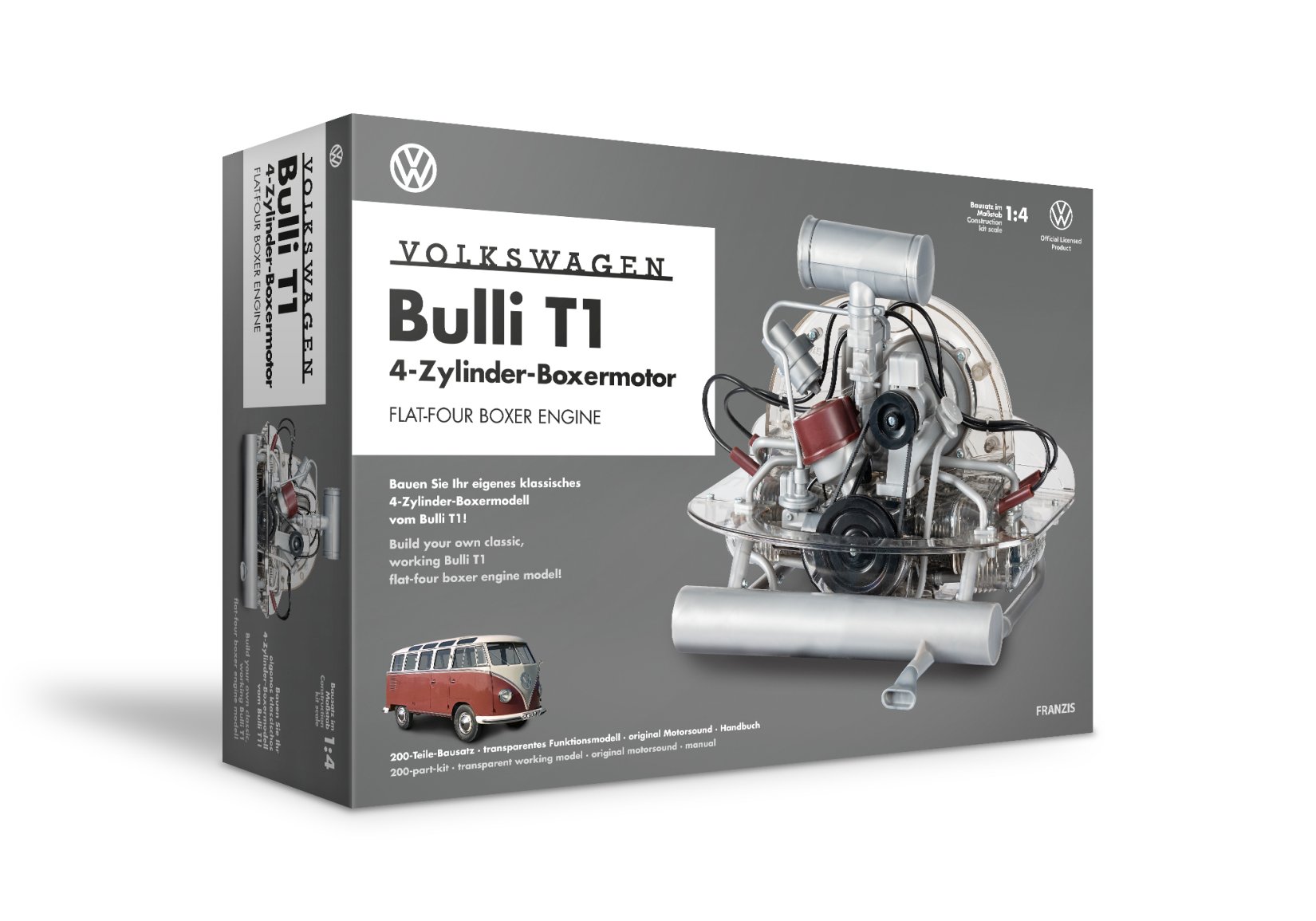 Build a detailed, transparent engine model of the Bulli T1 in around two hours. All parts of the kit move like the big model. With sound module. A richly illustrated manual with step-by-step instructions leaves no questions unanswered about the history of the Bulli and the boxer engine.