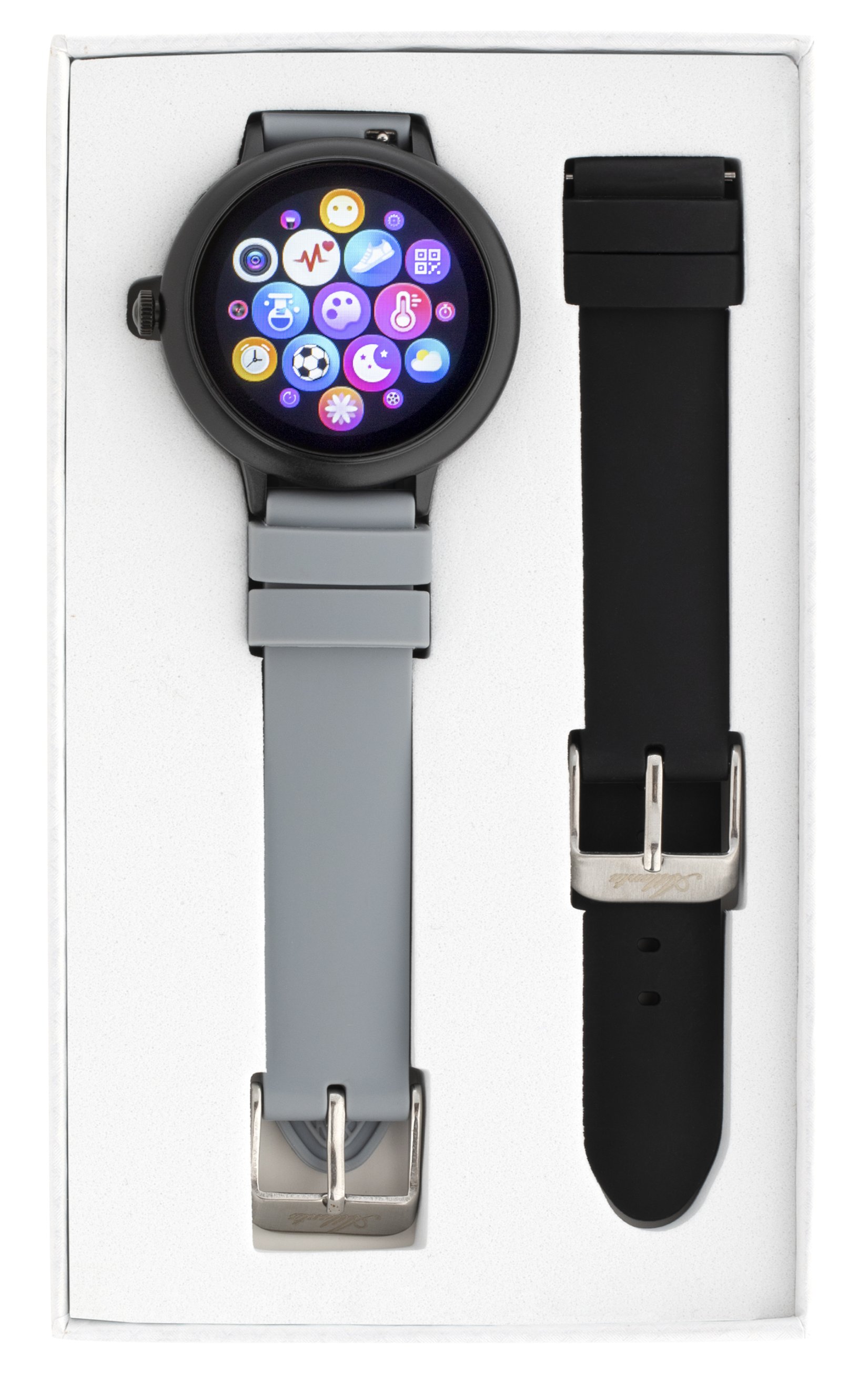 • 1 smartwatch with silver case and silicone strap + 1 additional strap plus 1 magnetic USB charging station and operating instructions