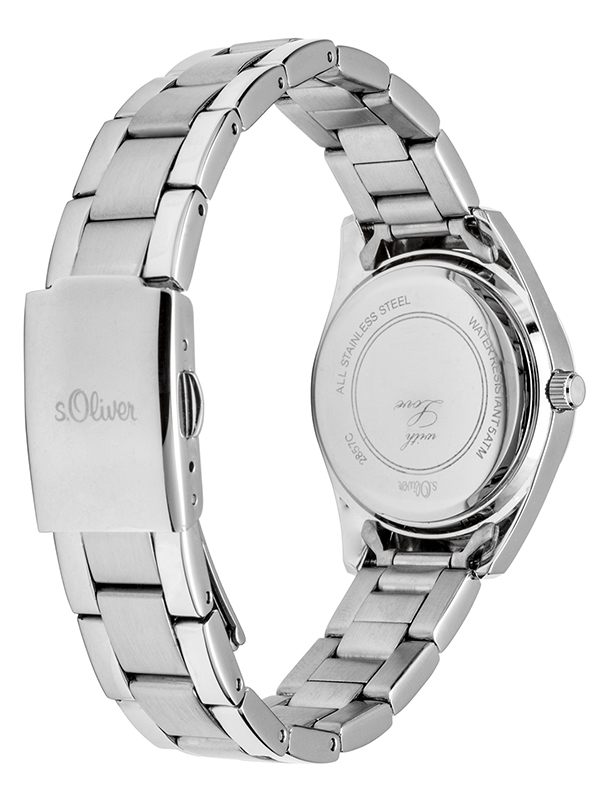 Boîtier en inox poli, avec strass sur la lunette, verre minéral inrayable, bracelet en inox de qualité, taille du boîtier 30 mm, largeur du bracelet : 14 mm, longueur du bracelet : 140 mm, étanche jusqu'à 5 ATM. Emballée dans un étui s.Oliver