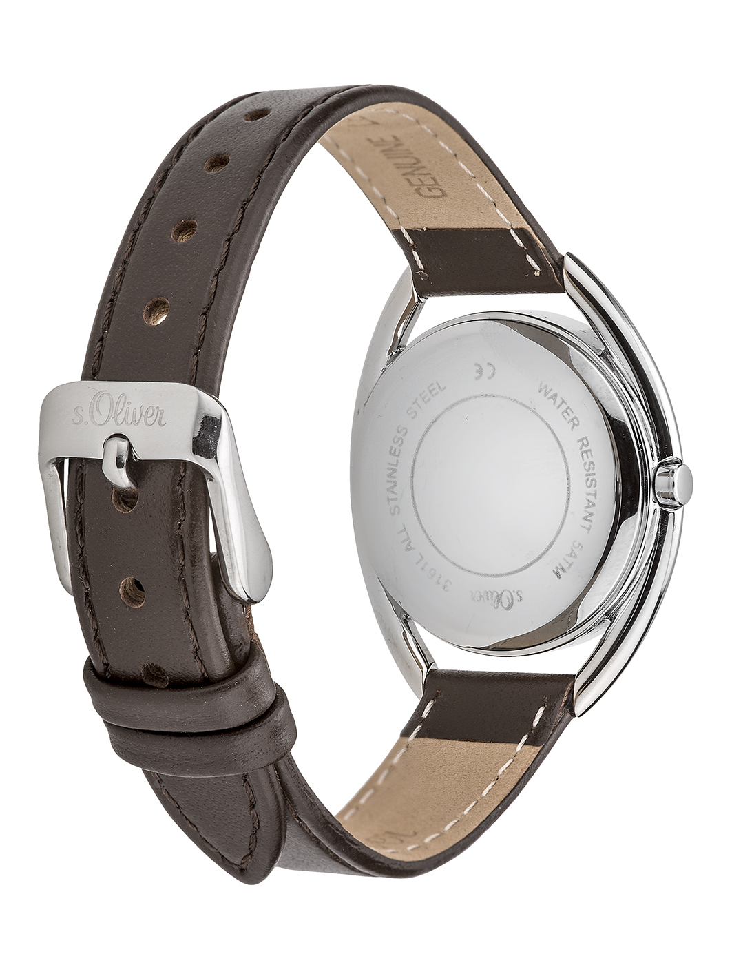 Boîtier en inox poli, verre minéral inrayable, bracelet en cuir avec boucle ardillon, taille du boîtier 32 mm, largeur du bracelet : 14 mm, longueur du bracelet : 70 x 115 mm, étanchéité 5 ATM. Emballée dans l’étui cadeau original s.Oliver.