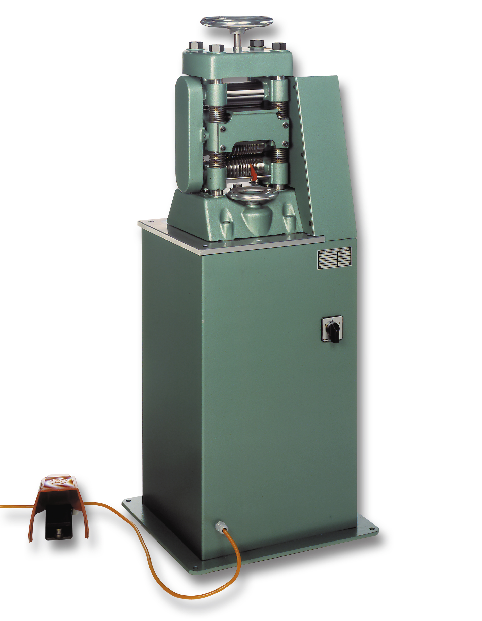 Das Walzwerk verfügt über 11 quadratische Rillen zum Walzen von Draht von 8 mm bis 1 mm. Die seitlichen Verlängerungsrollen bieten insgesamt vier Halbrunden von 4, 3, 2 und 1,5 mm. Zu den Sicherheitsmerkmalen gehören ein Not-Aus-Schalter, Sicherheitsbügel an der Vorder- und Rückseite des Walzwerks, Schutzvorrichtungen für die Verlängerungswalzen sowie Schutzvorrichtungen für die oberen Zahnräder.