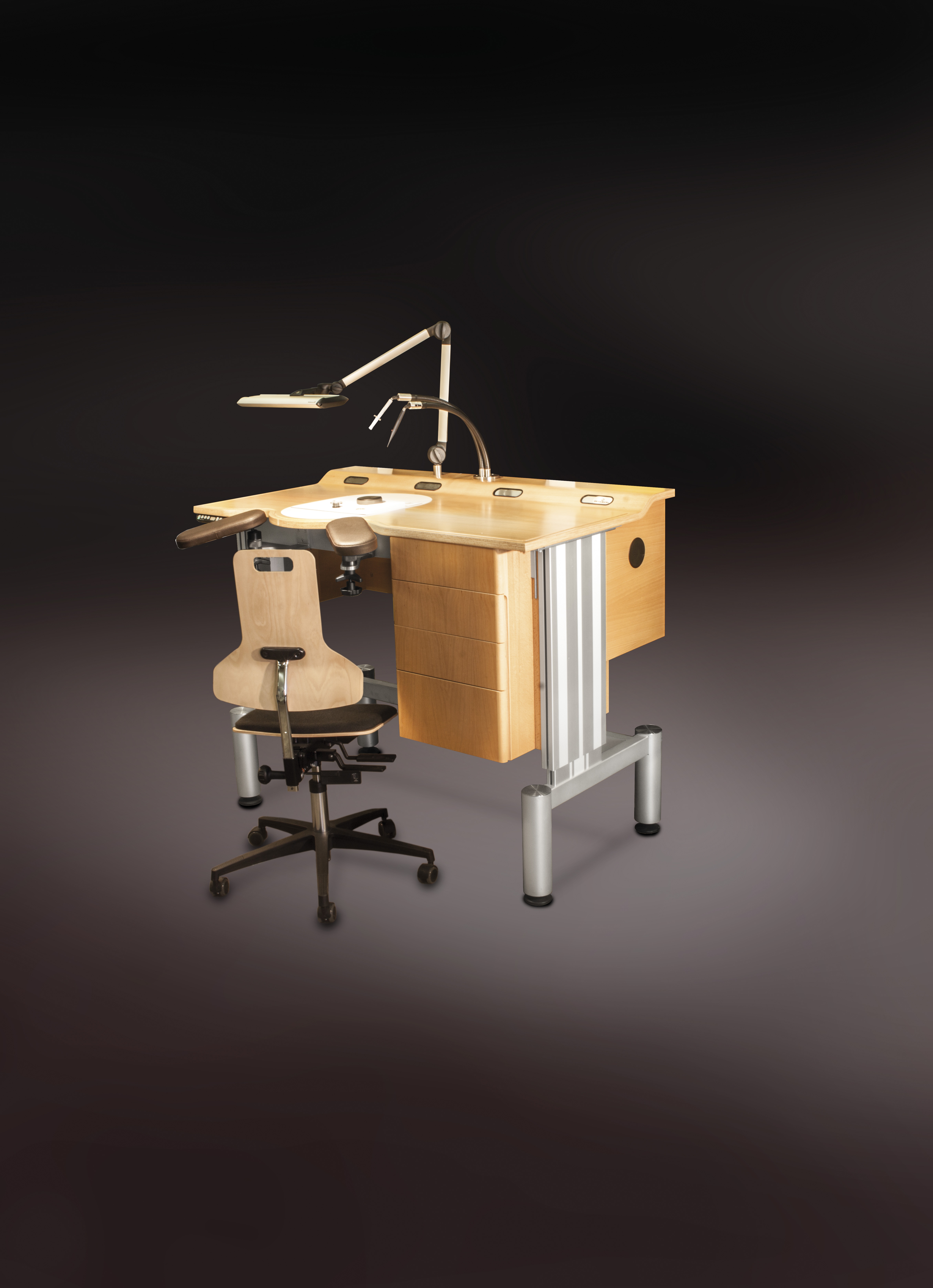 Tafelplaat uit massief hout met omlopend ingefreesde groef. Afmetingen: 405x400x20 mm. In de levering zijn metalen rails omvat, die op elke aanwezige tafel geschroefd kunnen worden. De tafelplaat met de armsteunen moet dan echter nog in de rails worden gedrukt. De armsteunen zijn in alle richtingen draai- en kiepbaar.