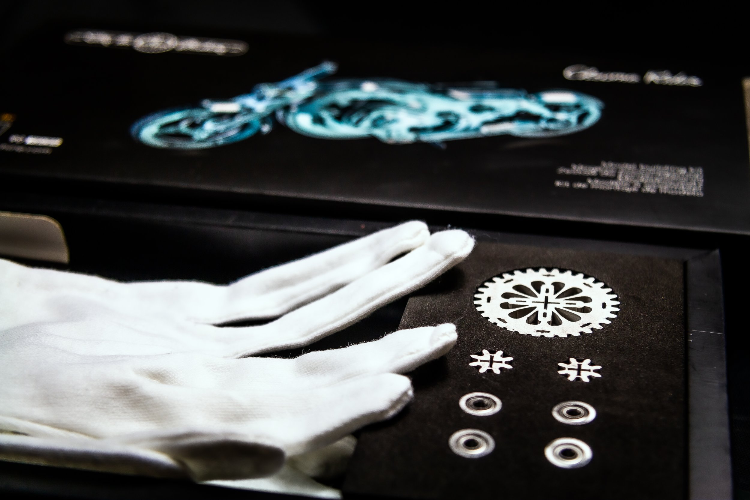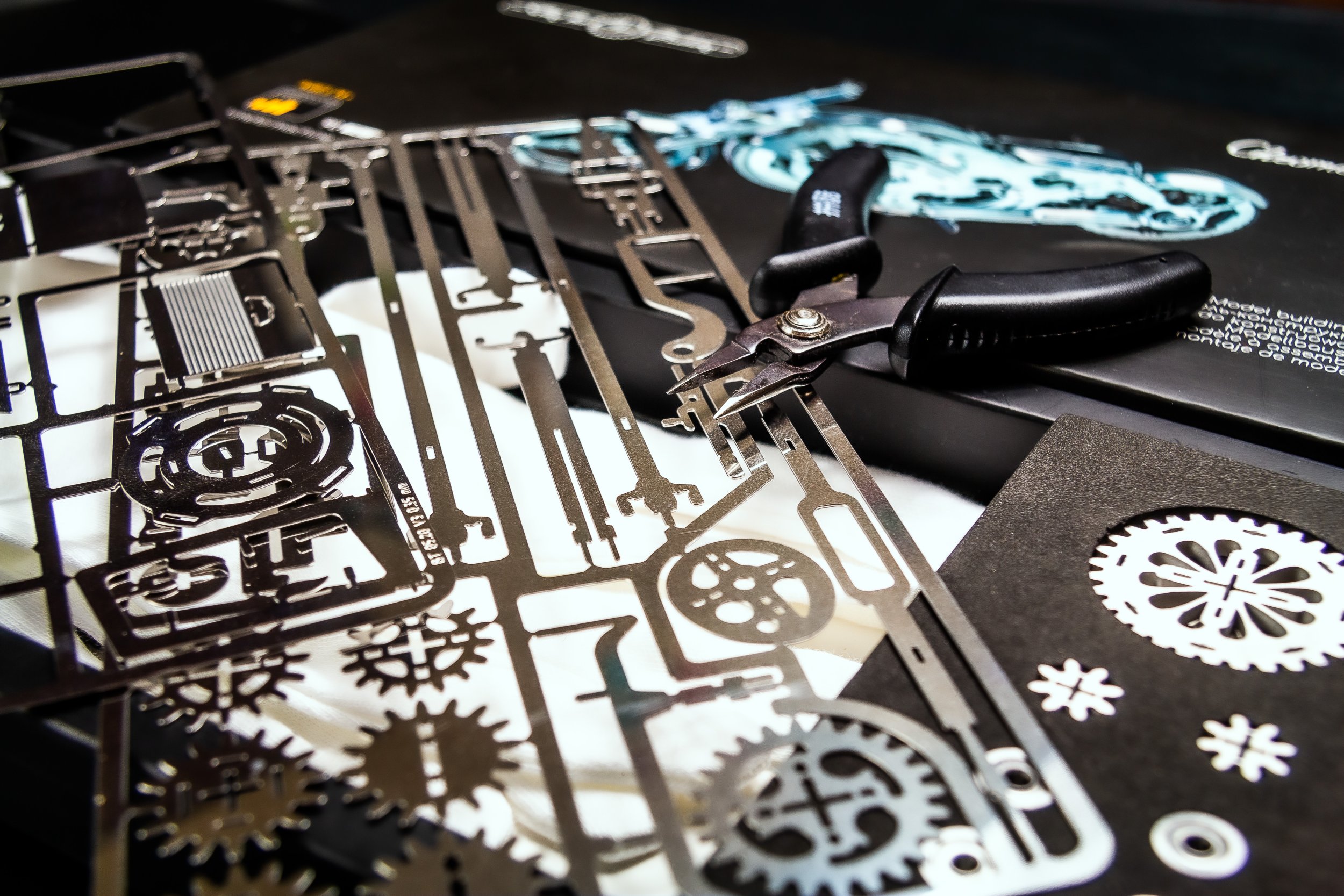 • Inhoud: 3 metalen platen met onderdelen, 6 tandwielen, wiellagers, rubberen loopvlakken, tang, vijl, handschoenen, poetsdoek en montagehandleiding