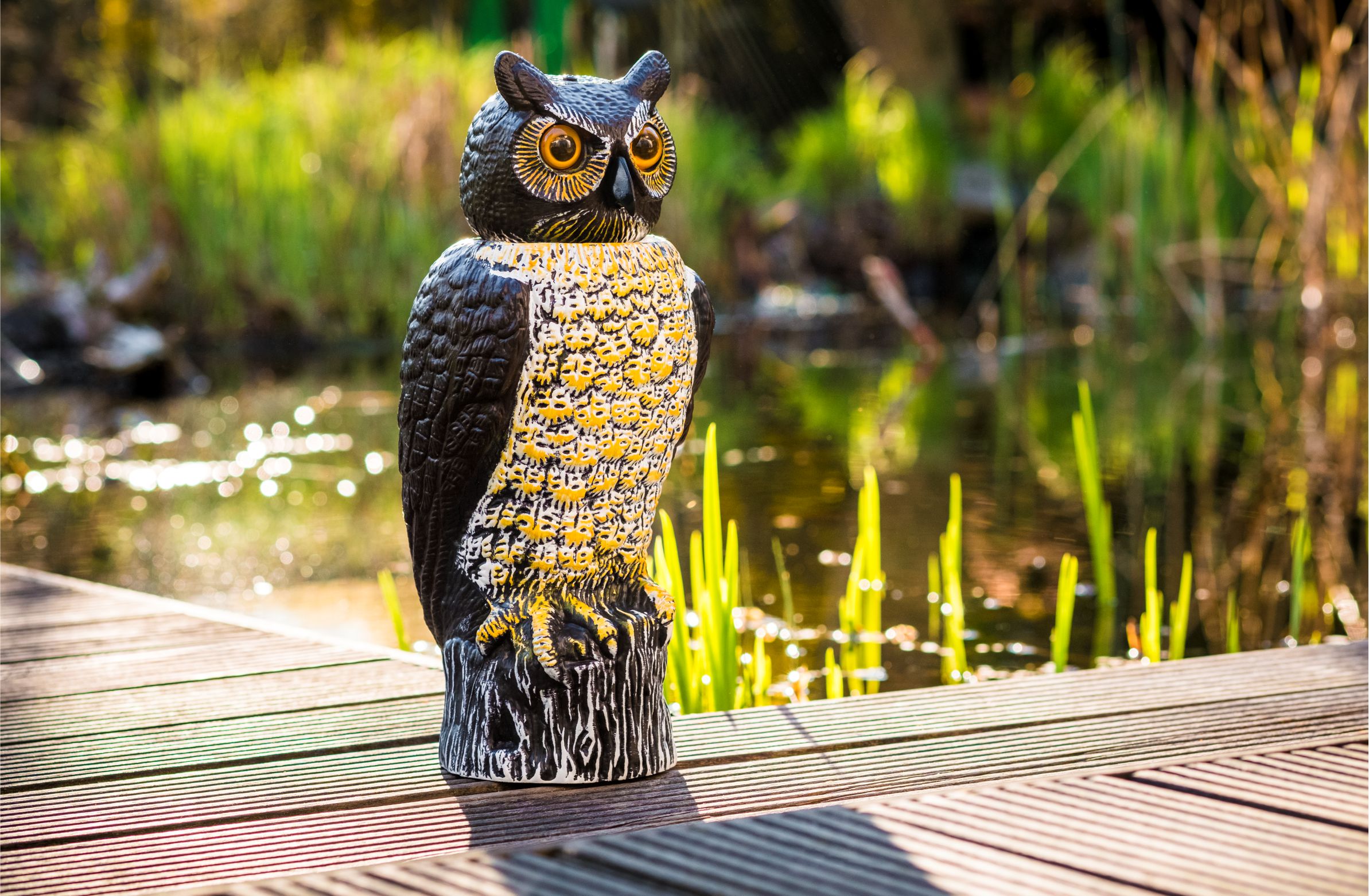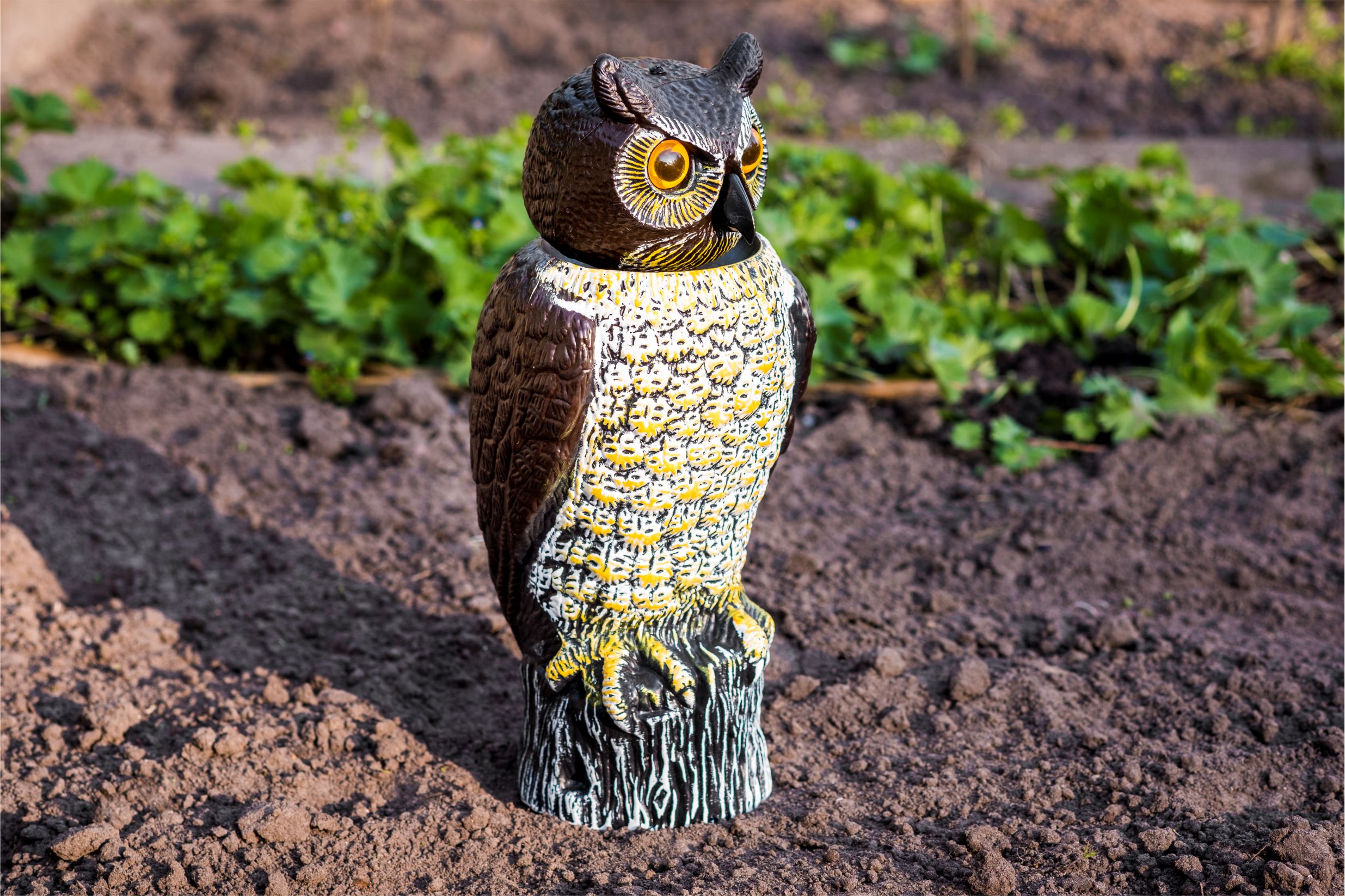 Deze uil jaagt vogels weg! Levensgrote uil met een beweegbare / roterende kop en reflecterende ogen